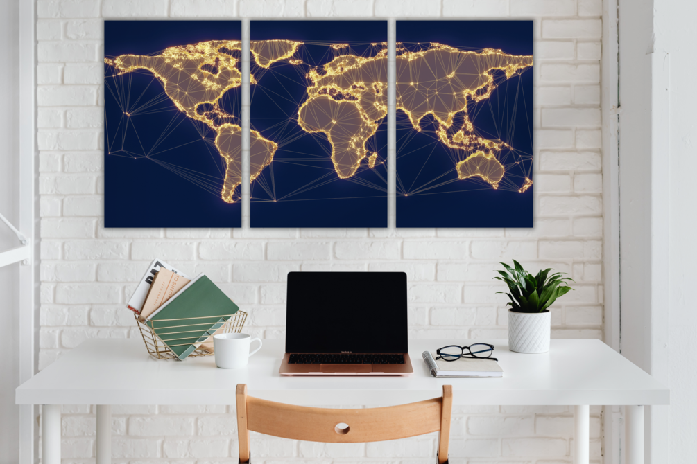 World map triptych, Digital world map art, Network map wall art, Global connection print, Gold and navy wall decor, Modern geometric art, Abstract map artwork, Digital download world map, Office wall art print, Technology-inspired decor